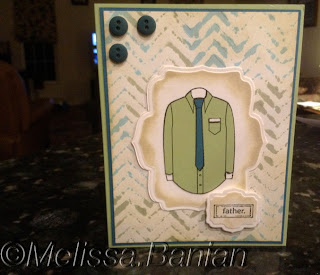 This next card I my card. The stamps are from Unity from the set The Man. The shirt image is great for paper piecing! The technique used for the background layer is a Technique Junkie technique called Pressed Stains from the June/July 2013 newsletter..