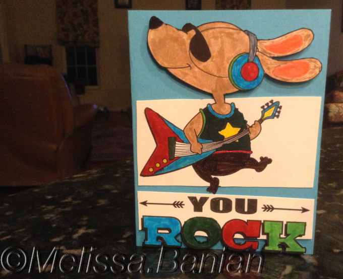 Here are the cards that my husband received today. The card from my DS has two digi images I received from Birdie Brown (www.birdiebrown.blogspot.jp/2013/06/June-freebies-challenge.html), Rockin' Doggie. Troy colored the images then I assembled the card for him. The bottom of the You Rock is popped on pop dots as well as the to of the Doggie's head and ears.